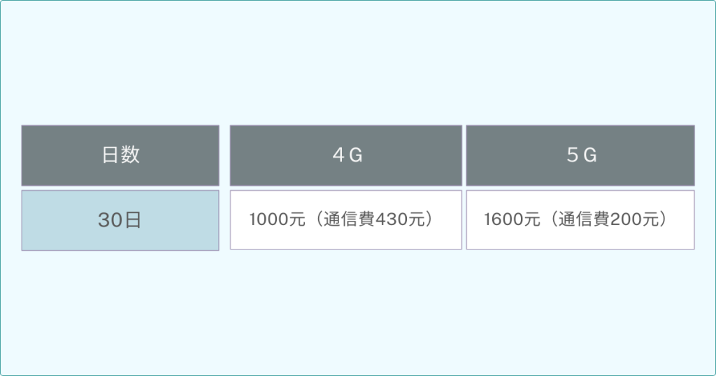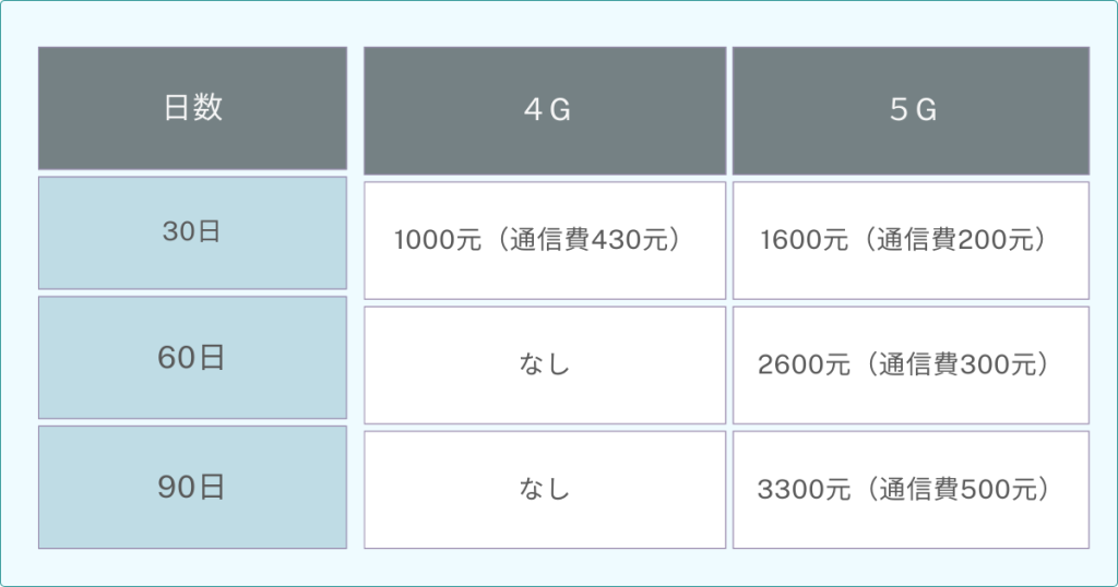5Gであれば30日が1日約53元、60日が1日約43元、90日が1日約36元です。4Gよりも日数の選択肢が多いのは嬉しいポイントですね。
